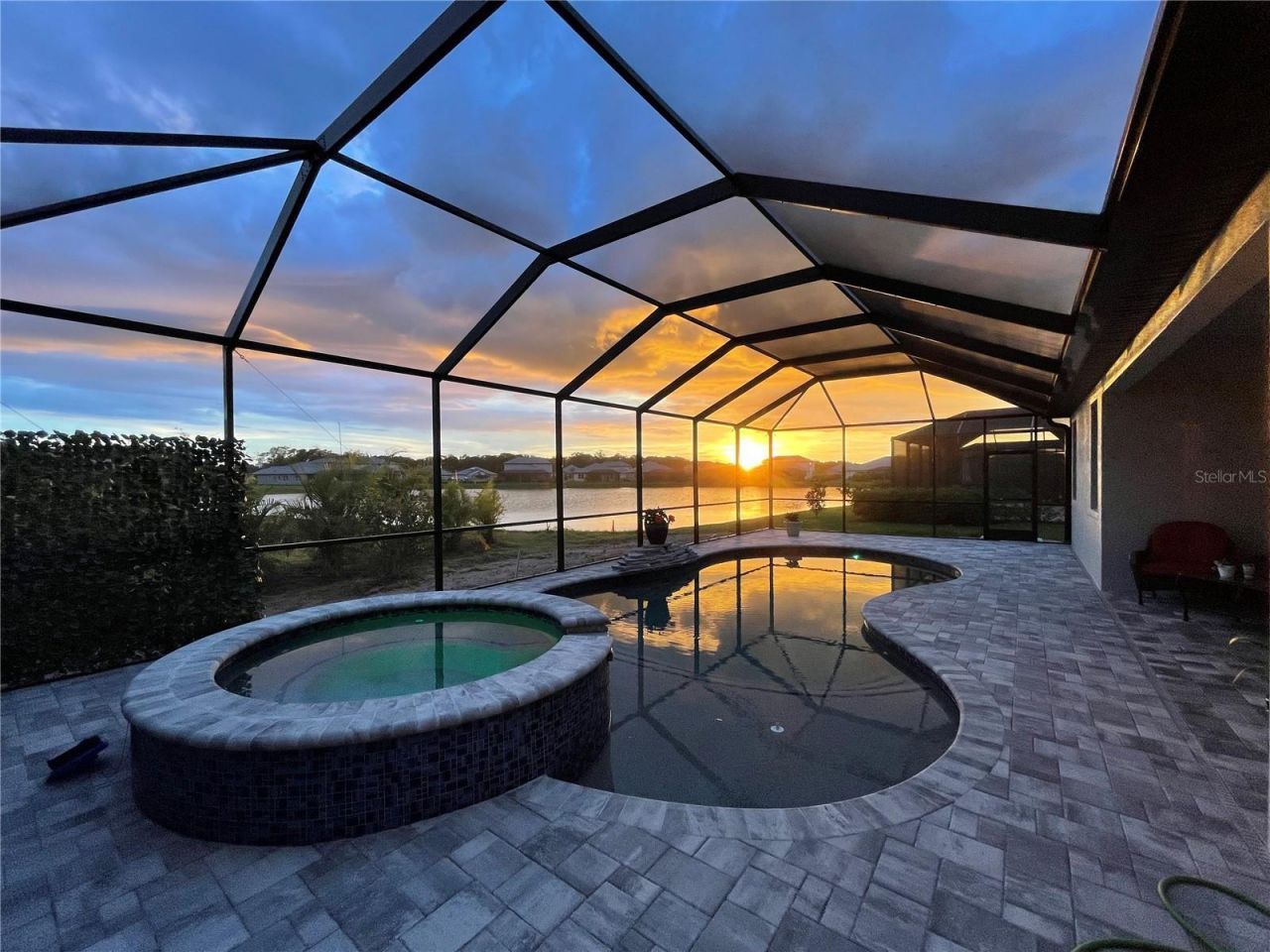 Modern & Pristine, this exceptional 4-bedroom, 3-bath residence with a sparkling pool and spa captures serene water views and effortless style. Thoughtfully upgraded throughout, the home showcases wood-look plank flooring, tray ceilings, designer lighting and fans, pendant accents, and added recessed illumination for a warm, modern glow. Expansive sliding glass doors open wide to the lanai for seamless indoor-outdoor living. Each bath is finished with solid wood cabinetry, Cambria quartz countertops, and sleek frameless glass enclosures. A generously sized laundry and utility room, dedicated pool bath, mudroom/drop zone, and rain-glass front entry add both function and flair. The kitchen is a true centerpiece-featuring Cambria quartz surfaces, a stylish tile backsplash, shaker cabinetry, and GE Profile stainless steel appliances, including a gas cooktop with range hood and a wall-mounted double oven topped with convection microwave. A farmhouse sink, under-cabinet lighting, and an oversized walk-in pantry complete the space with both beauty and practicality. Step outside to a screened, paver lanai where a gas-heated pool and spa shimmer overlooking tranquil water views. The tandem three-car garage offers epoxy flooring, and the paver driveway enhances the home's crisp curb appeal. ***BONUS: A leased solar panel system helps keep electric costs in check.***HOA AMENITIES Include: Community pool, outdoor kitchen, playground, dog park, and pickleball courts.***LOCATION HIGHLIGHTS: Convenient access to SR-64 and just moments from top-rated Lakewood Ranch schools-Gullett Elementary, Lakewood Ranch High, Mona Jain Middle, LECOM, and Manatee Tech East Campus. You're minutes from shopping, dining, fitness studios, salons, vibrant nightlife, downtown Sarasota, Sarasota International Airport, award-winning Gulf beaches, Ellenton Outlets, and UTC's premier shopping and dining scene.